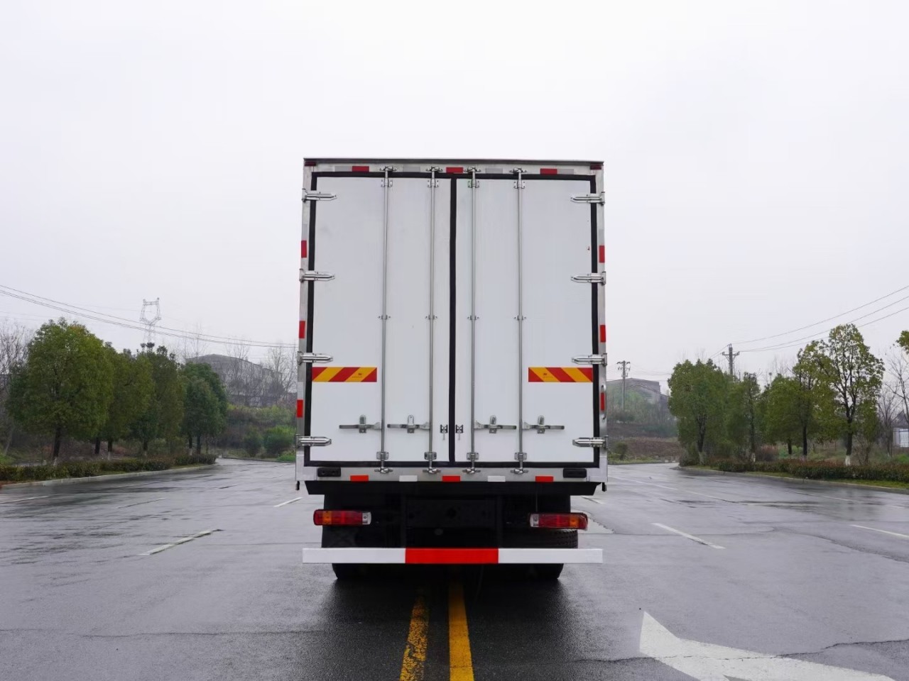 | Body Configuration | The body material is made of internal and external fiberglass, with a middle 8CM polyurethane insulation board, double rear doors, optionally equipped with side doors on the front right side of the body, the bottom is made of patterned anti-slip aluminum plate with front drainage holes, the door edge is sealed with labyrinth-type rubber sealing strip, aluminum alloy profile wrapping, stainless steel corner wrapping, stainless steel door lock, stainless steel door frame and hinge, and energy-saving LED lighting inside the body. |