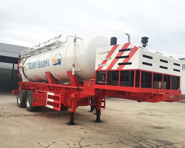 The vacuum system is powered by either the Power Take-Off (PTO) or an auxiliary engine. This system includes a cylindrical tank and a hydraulically opening full-diameter tailgate. The tank trailer also has a vacuum system that is specifically designed to collect and transport waste.