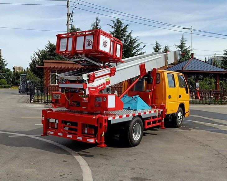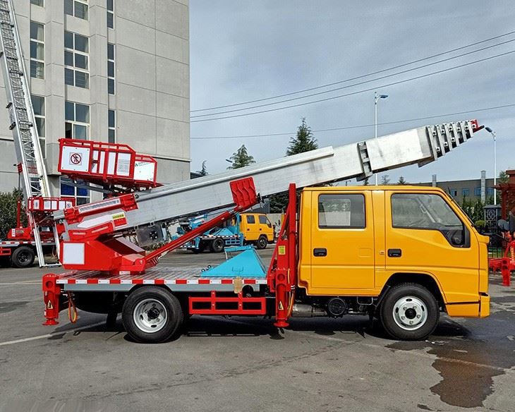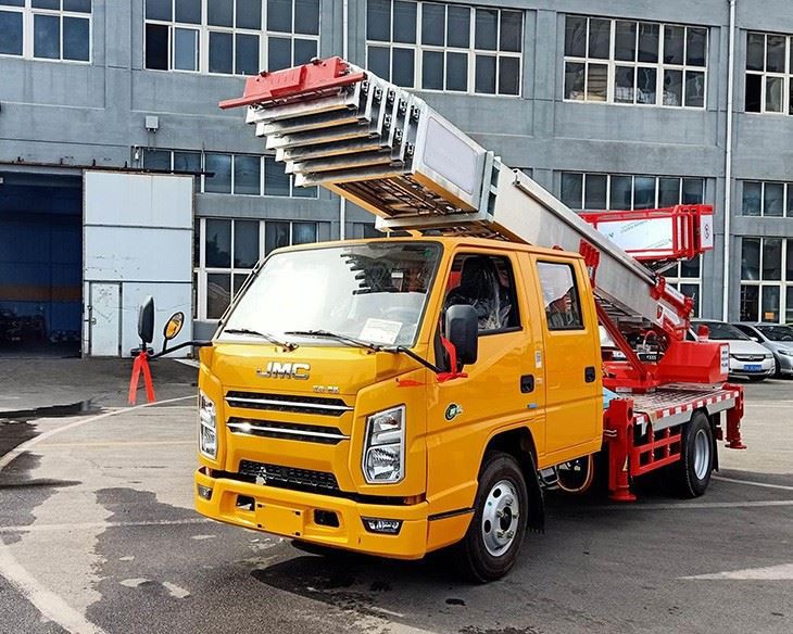 The aerial ladder truck, also known as the ladder lift truck, high-altitude transport vehicle, aerial work vehicle, or aerial ladder moving truck, serves various purposes including project leasing, curtain wall construction, roof waterproofing, solar panel installation, advertising, power maintenance, air conditioning installation, moving company services, cement and sand handling, ship maintenance, road and bridge repair, and more. Our JMC ladder lift bucket truck boasts a 32-meter height capacity, equivalent to an 11-story building, and is constructed with high-strength special aluminum mounted on a JMC truck. It has a material handling capacity of 400 kg.
