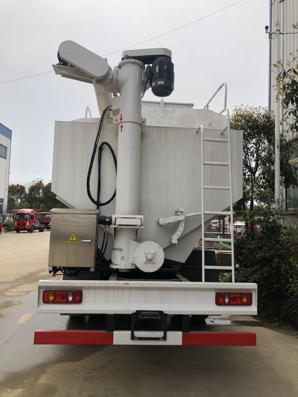 Bulk feed truck is mainly used to transport bulk feed products or raw grains from feed mills to livestock farms, poultry farms, and feed processing users. In addition, it can also be used to transport certain non-corrosive powdery and granular raw materials, such as powder materials in pharmaceutical factories and grain warehouse turnover. The feed tank of this type of vehicle is mounted on the chassis of the truck and consists of a tank assembly, a conveying system (including a horizontal unloading system, vertical unloading system, and movable unloading system), a bulk feed tank hydraulic system, a bulk feed tank electric system, a pneumatic compartment mechanism, etc. A gate is provided at the bottom of the tank, and a horizontal screw conveyor is installed below, which is driven by the output power of the automobile gearbox, and then drives the high-pressure oil pump to drive the hydraulic system. The hydraulic motor of the bulk feed truck tank drives the blade shaft and blades of the horizontal screw conveyor to rotate through the transmission device, and the feed is discharged through the movable conveying system. A movable unloading auger placed flat on the roof can rotate and lift freely. The spiral pipe on the top lies flat on the tank top during transportation; when unloading, it is lifted so that the discharge port at the end of the pipe is connected and aligned with the feed door on the top of the storage tank of the livestock and poultry farm to complete the unloading.