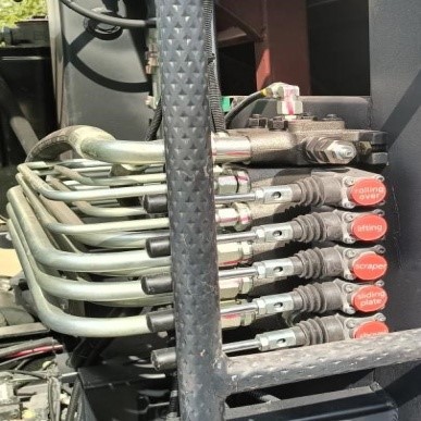 Compaction is controlled electrically via push-buttons, and manually in case. There is an emergency stop button on each of side the truck on the control panel.