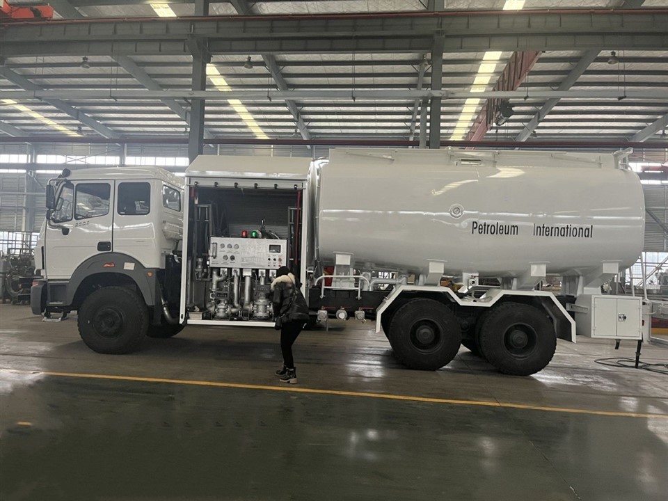 The truck features a 25,000-liter aluminum alloy fuel tank, which is both lightweight and corrosion-resistant, ensuring long-term reliability. The vehicle is equipped with advanced fuel handling systems, including a Gorman Rupp centrifugal pump that guarantees efficient fuel transfer. The refueling process is facilitated by single reel hoses, capable of delivering fuel at a rate of 1,200 liters per minute while refueling or pumping is managed at a rate of 300 liters per minute.