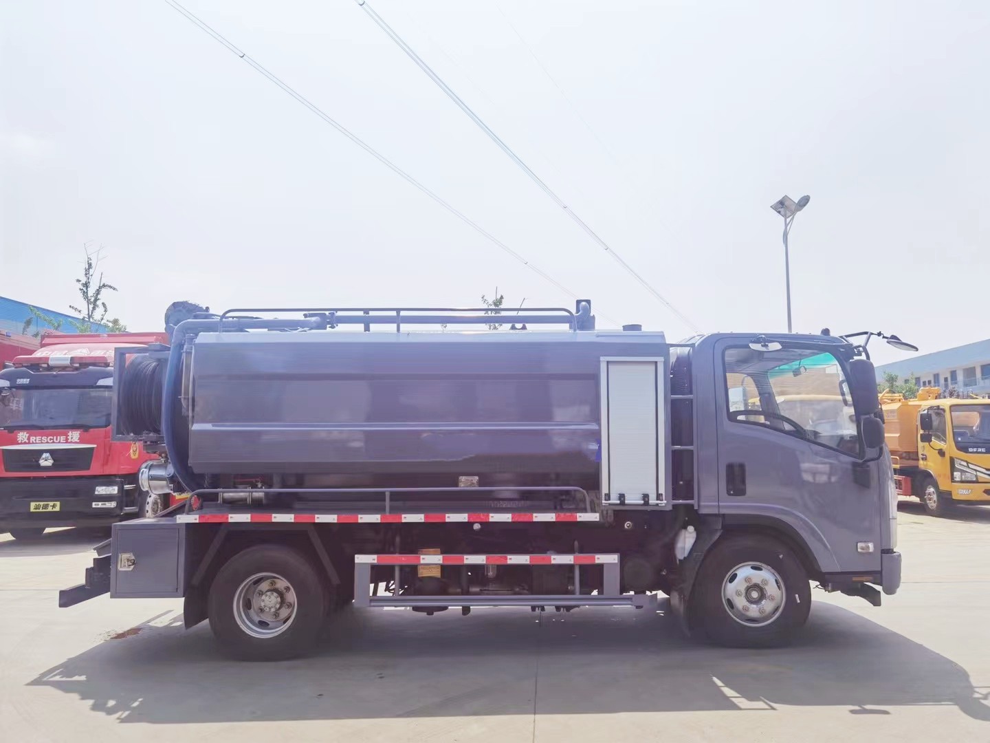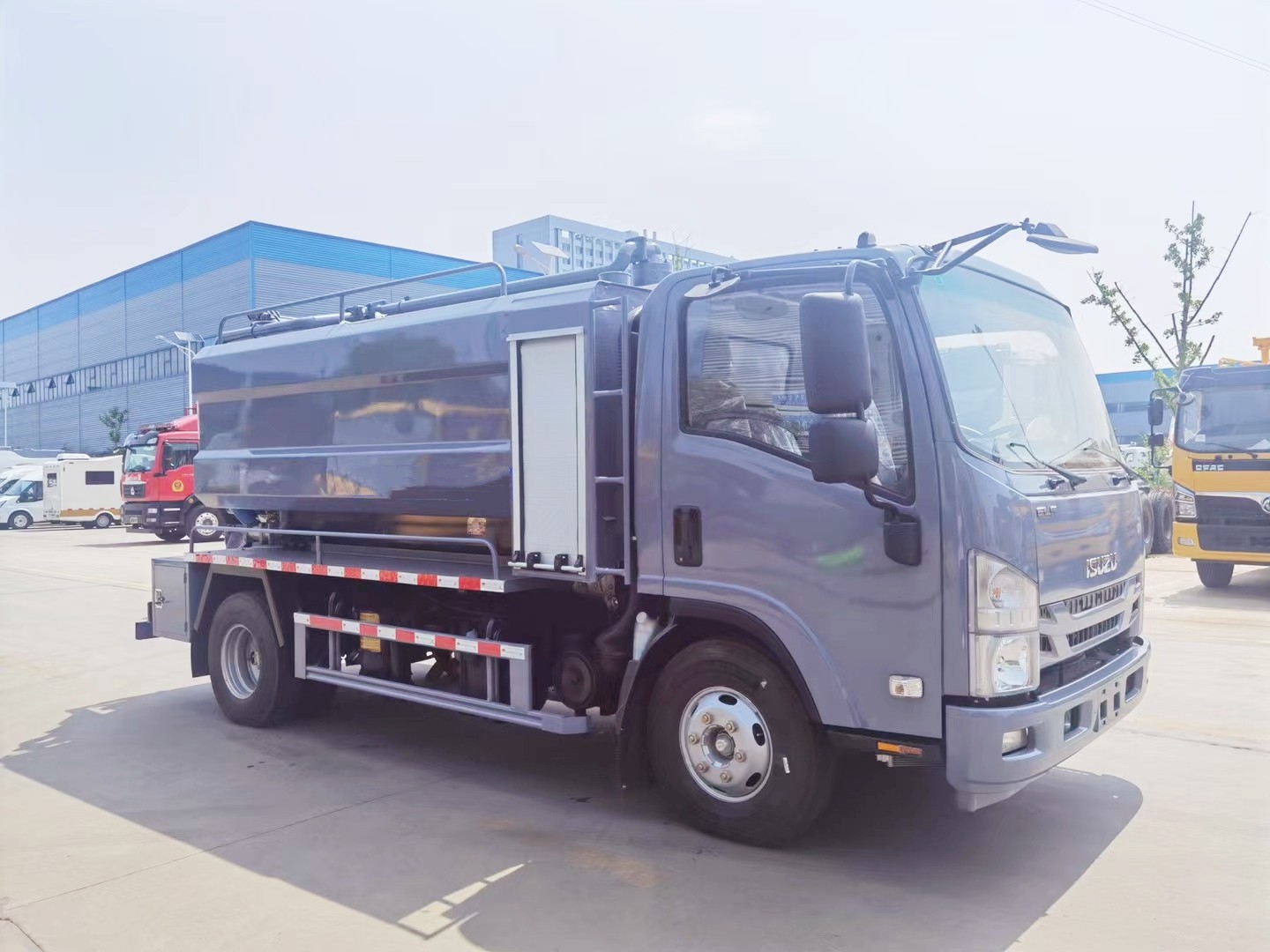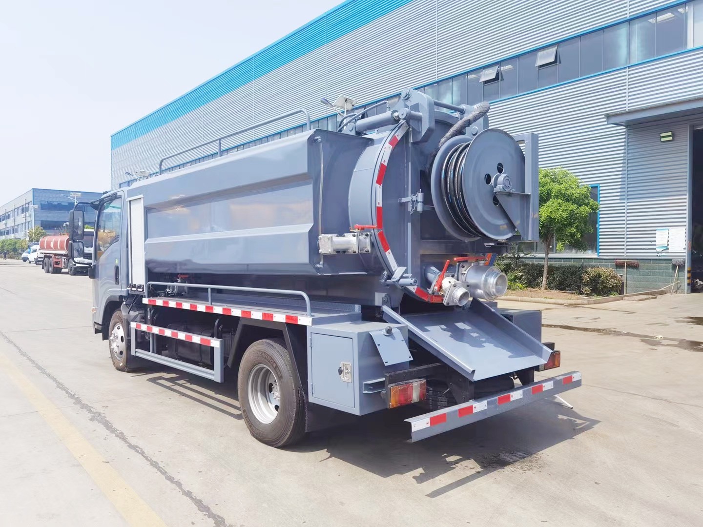 The ISUZU Combined Sewer Jetting Truck is mounted on the ISUZU KV600 chassis, specially designed for cleaning drains, sewer manholes, and affiliated tasks. The Combined Sewer Truck is composed of a vacuum and water tank, hydraulic system, vacuum and high-pressure jetting pumps, jetting system and hose reel, suction boom, and control system. The power take-off drives the high-pressure water pump, vacuum pump, and hydraulic pump to work, and the hydraulic control pipeline of the hydraulic pump realizes the system control of the work of the high-pressure water pump, vacuum pump winch, etc.