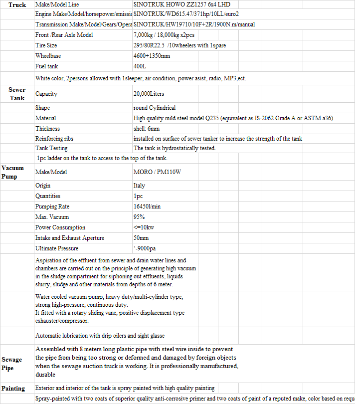 The SINOTRUK 20CBM Vacuum Suction Truck is used to collect and transfer sludge and sewage /self-priming and self-discharging / suitable for collecting and transporting feces, mud, crude oil, and so on / also ideal for suction, shipment, and discharge of sludge in the sewer, larger objects such as sewer mud, silt, stones, and bricks.